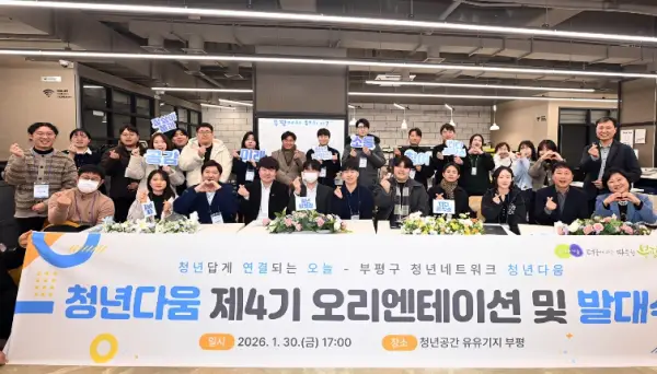 인천 부평구가 청년네트워크 '청년다움' 4기 발대식을 지난 1월 30일 청천동 청년공간 유유기지 부평에서 진행했다. 이번 4기는 대학(원)생, 직장인, 청년창업가, 취업준비생 등 다양한 배경의 20~30대 청년 27명으로 구성됐으며 이 중 14명은 재위촉됐다. 행사에서는 위원들이 그간의 활동 결과를 공유하고 앞으로의 역할과 운영 방향에 대해 오리엔테이션을 실시했다. 신규 위원에게는 위촉장이 전달됐고 지난해 우수활동자에게는 감사장이 수여됐다. 이어진 간담회에서는 청년들이 […] 더 보기