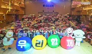BNK부산은행은 지난 25일 문현동 부산은행 본점과 부산국제금융센터(BIFC) 일원에서 어린이와 가족이 함께하는 참여형 축제 ‘아이러브 페스티벌’을 개최했다. 페스티벌 참석자들이 단체 기념촬영을 하고 있다. 부산은행 제공