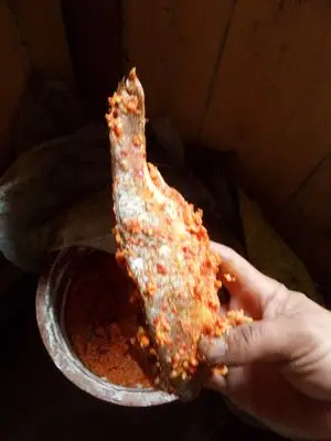 중국 귀주성 첸동난주 리핑현 황강촌 동족마을에서 초어(草魚) 식해를 독에서 꺼내고 있다. 사진=전경수 교수