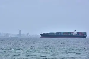 호르무즈 해협 케슘섬 해안에 18일 이란의 해협 봉쇄로 발이 묶인 컨테이너선이 보인다. 뉴시스